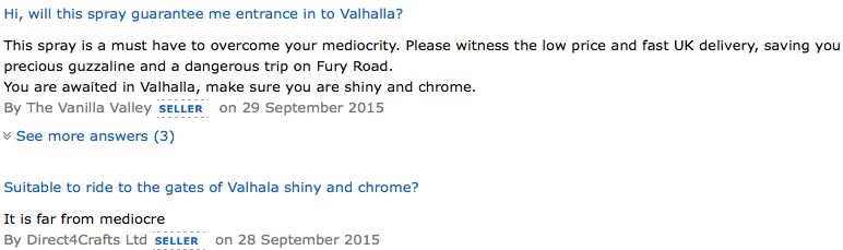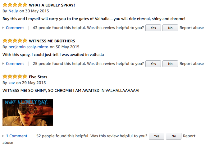 (『マッドマックス 怒りのデスロード』公開から3ヶ月間、カリフォルニア州オークランド50マイル圏内でシルバーケーキスプレーが入手不可能になった)